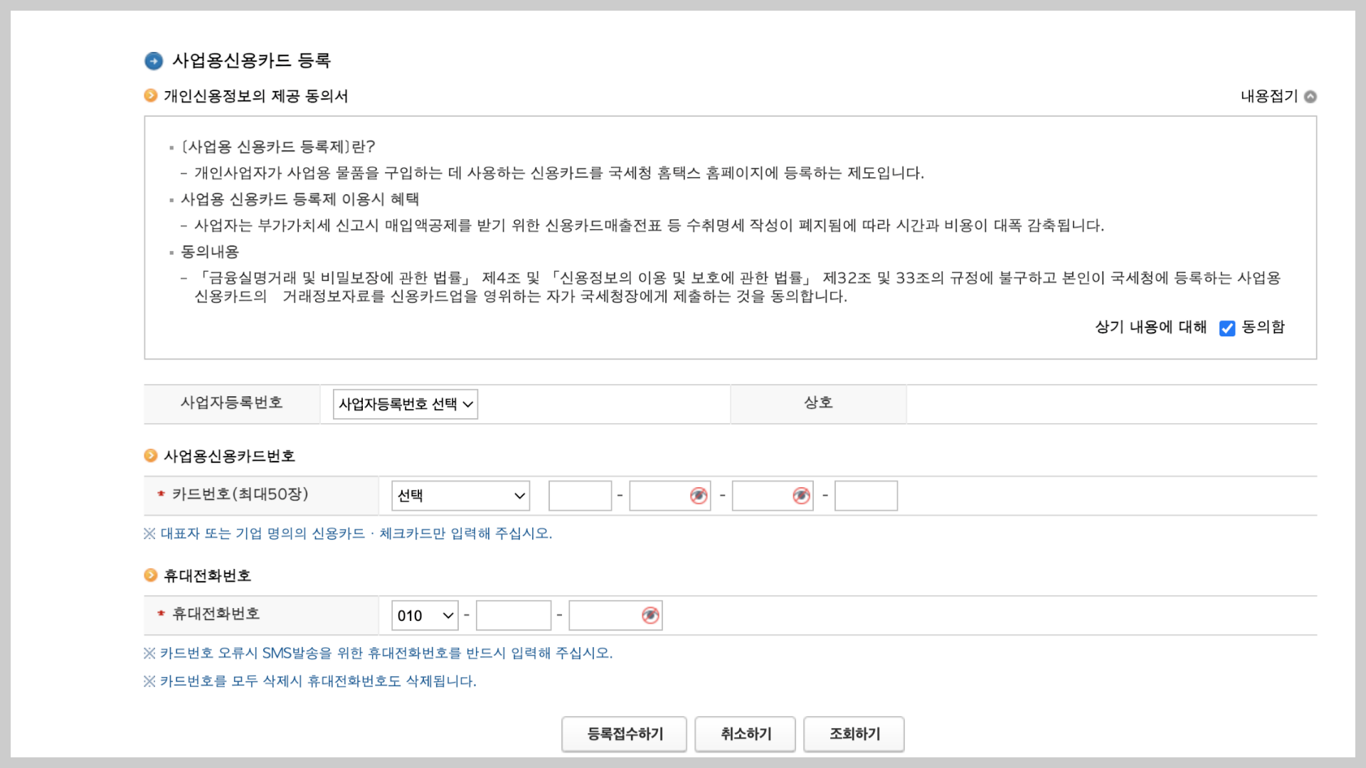 아래 사업자등록번호를 선택하고 카드사선택, 카드번호, 휴대폰번호를 입력후 "등록접수하기"를 눌러주시면 됩니다.