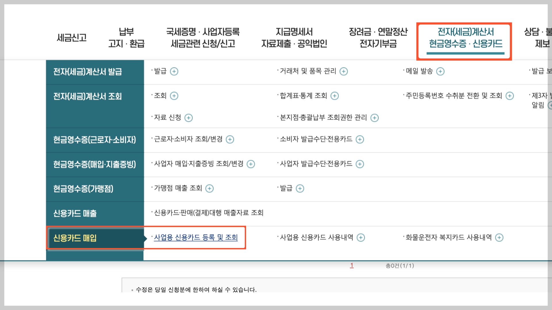 로그인을 하셨다면 상단에 있는 "전자(세금)계산서 현금영수증 신용카드" 를 선택하면 아래 차이 뜰거에요.