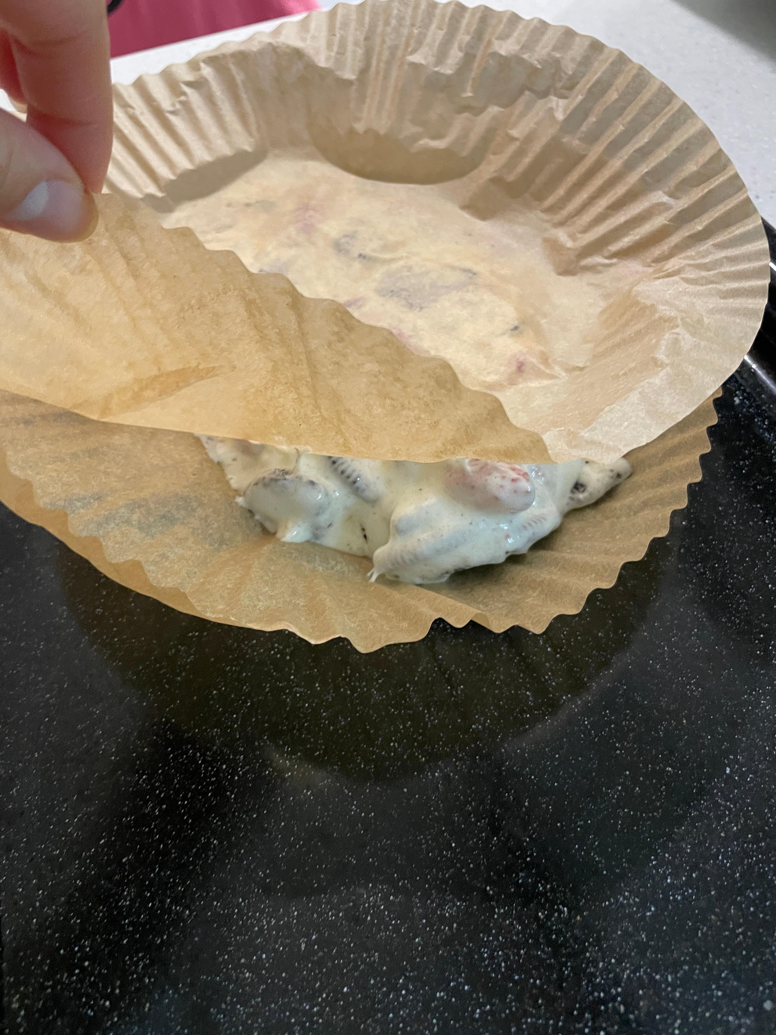 💡유산지에 올리고 틀을 잡으려고 했는데 유산지에 달라붙어서 안떨어지더라구요. 왜그런가 생각했는데 탈지분유를 안 넣어서 입니다. 그래도 굳으면 떨어지겠지 하는 생각으로 얼렸다 꺼냈는데 아주 깔끔하게 잘 떨어졌어요 😊