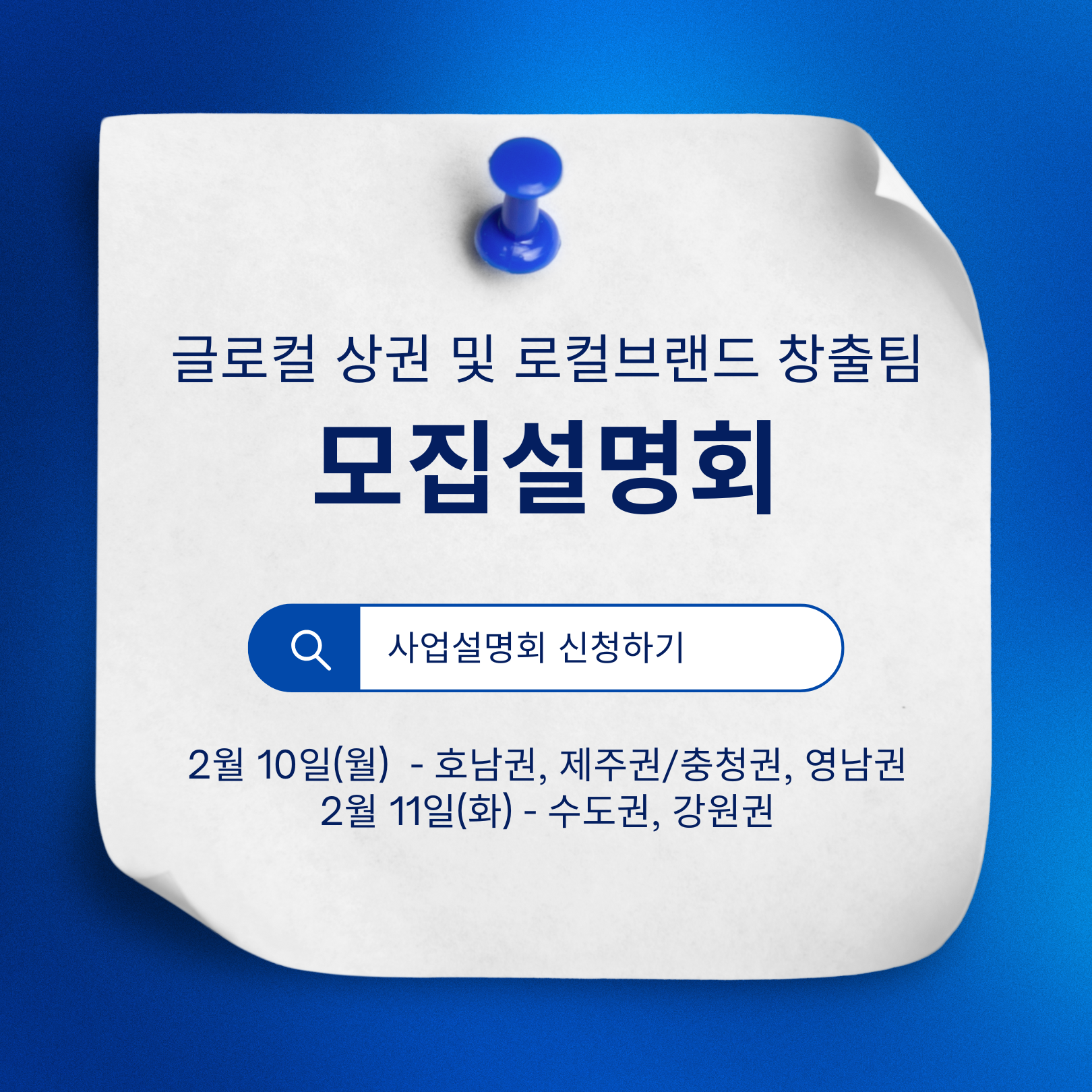 - 로컬 크리에이터가 중심이 되어 다양한 공간‧콘텐츠를 결합시켜 국내외 유동인구를 끌어들이는 글로컬 상권 및 로컬브랜드 창출팀 모집 공고 (공고 : 2월 14일 예정)